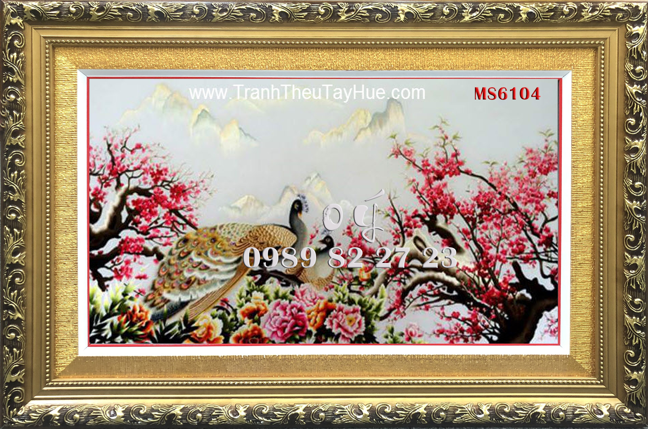 Tranh thêu hoa đào đôi chim công ms 6104 được thêu hoàn toàn bằng tay. Thiết kế mẫu theo yêu cầu và giao hàng tận nơi miễn phí. LH 098 982 27 23