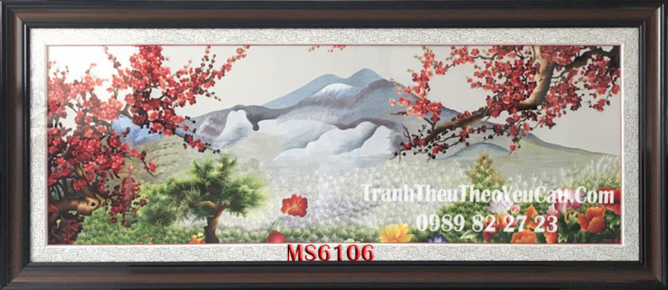 Tranh thêu hoa đào khổ lớn treo phòng khách ms 6106