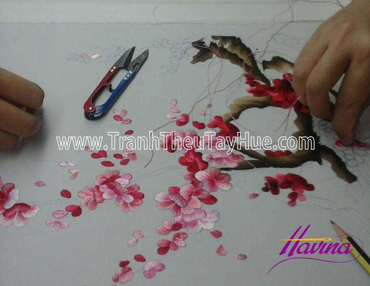 Nguyên liệu được sử dụng: Chỉ tơ kết hợp với chỉ DMC Pháp thêu trên vải lụa