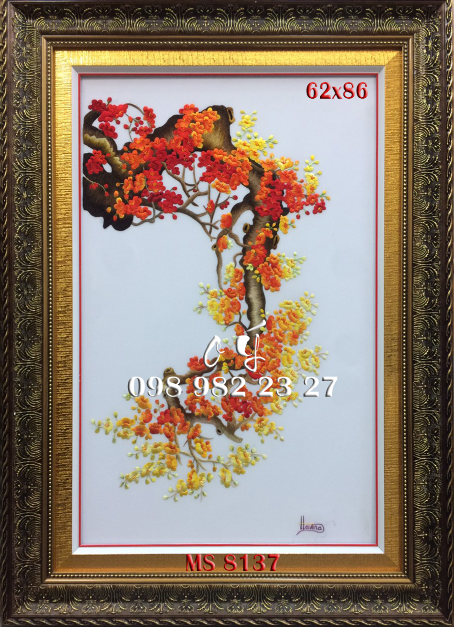 Nguyên liệu được sử dụng: Chỉ tơ kết hợp với chỉ DMC Pháp thêu trên vải lụa