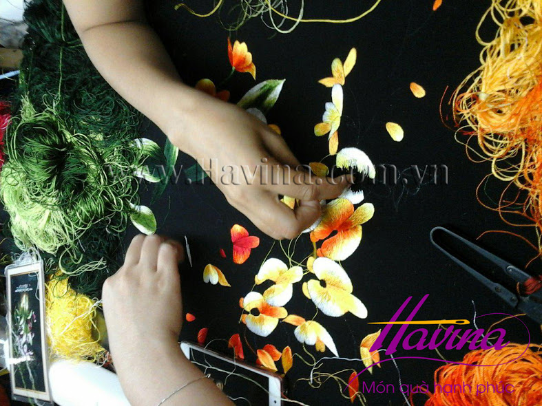Nguyên liệu được sử dụng : Chỉ tơ kết hợp với chỉ DMC Pháp thêu trên vải lụa