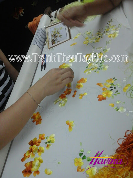 Nguyên liệu được sử dụng: Chỉ tơ kết hợp với chỉ DMC Pháp thêu trên vải lụa