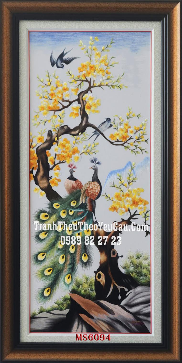 Tranh thêu hoa mai vàng kết hợp cặp chim công thích hợp làm quà tặng đám cưới, tân gia hoặc bạn có thể trang trí cho chính ngôi nhà mình. 098 982 27 23