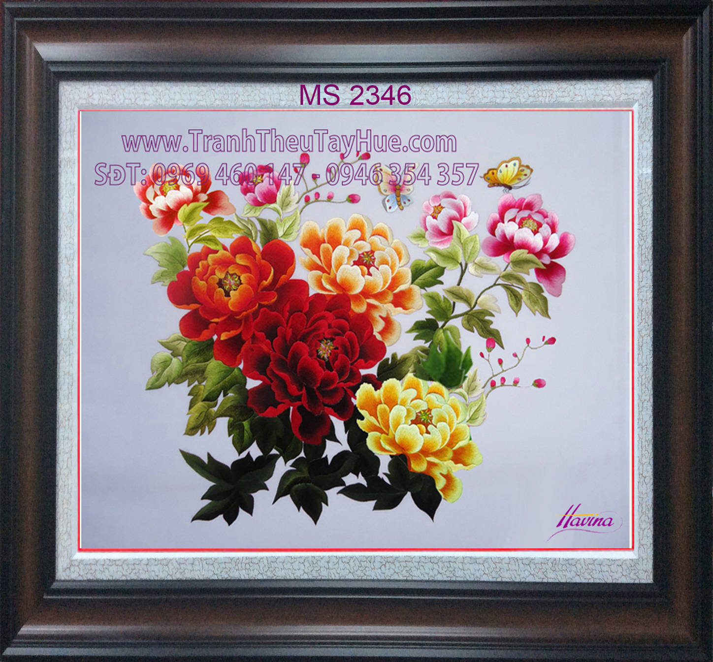 Tên tác phẩm: Tranh thêu hoa mẫu đơn 8 bông