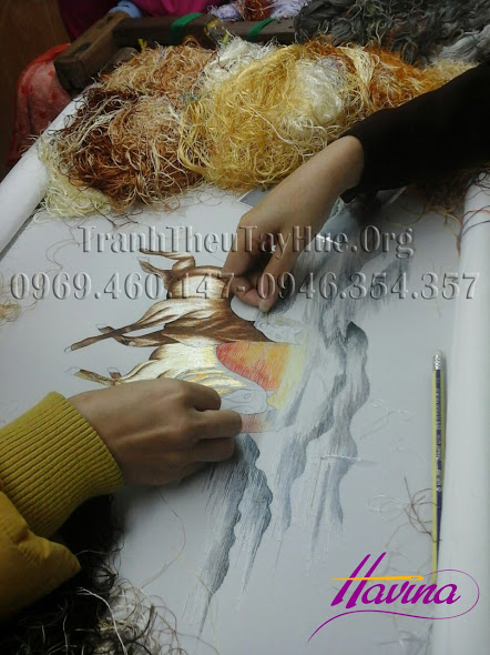 Nguyên liệu được sử dụng: Chỉ tơ kết hợp với chỉ DMC Pháp thêu trên vải lụa