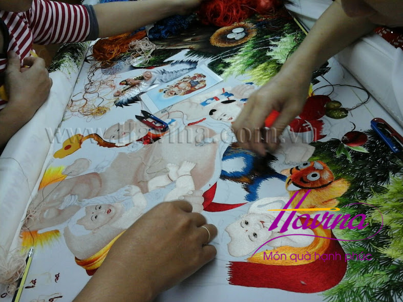 Nguyên liệu được sử dụng: Chỉ tơ kết hợp với chỉ DMC Pháp thêu trên vải lụa