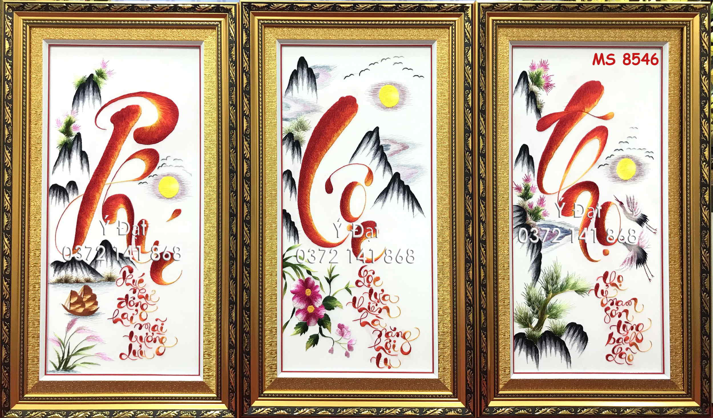 Tranh thêu chữ Phúc Lộc Thọ là ước nguyện tiêu biểu cho ba hạnh phúc lớn nhất của con người là Phúc là con cháu đầy đủ ngoan hiền. Lộc là tài lộc dồi dào, Thọ là sống lâu không bệnh tật và Phúc là đông con nhiều cháu hiếu thảo ngoan hiền. Bộ thư pháp chữ Phúc Lộc Thọ có nhiều cách thể hiện và có nhiều câu chúc kèm theo nhưng ý nghĩa của chúng vẫn xoay quanh mong ước “tham lam chính đáng” trên của con người.