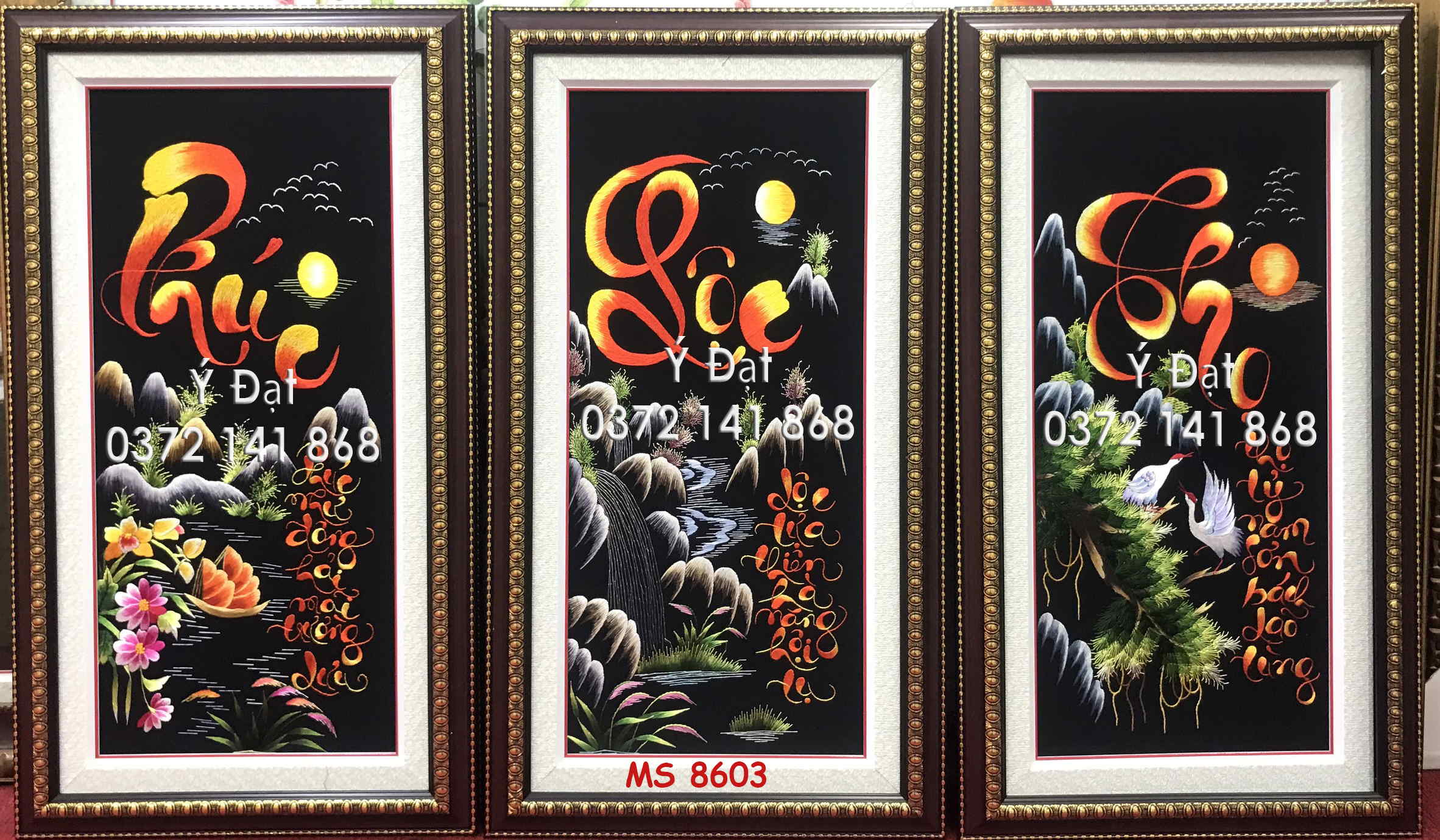 Tranh thêu chữ Phúc Lộc Thọ là ước nguyện tiêu biểu cho ba hạnh phúc lớn nhất của con người là Phúc là con cháu đầy đủ ngoan hiền. Lộc là tài lộc dồi dào, Thọ là sống lâu không bệnh tật và Phúc là đông con nhiều cháu hiếu thảo ngoan hiền. Bộ thư pháp chữ Phúc Lộc Thọ có nhiều cách thể hiện và có nhiều câu chúc kèm theo nhưng ý nghĩa của chúng vẫn xoay quanh mong ước “tham lam chính đáng” trên của con người.