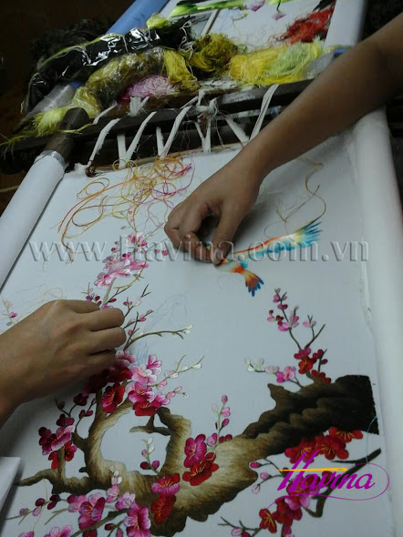 Nguyên liệu được sử dụng: Chỉ tơ kết hợp với chỉ DMC Pháp thêu trên vải lụa