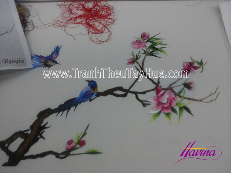 Nguyên liệu được sử dụng: Chỉ tơ kết hợp với chỉ DMC Pháp thêu trên vải lụa
