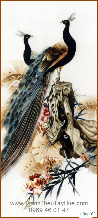 Tranh thêu con công là loại tranh thêu truyền thống được thêu hoàn toàn bằng tay bởi những thợ thêu dày dặn kinh nghiệm của đất Cố Đô Huế. Những bức tranh thêu con công là loại tranh thêu đặc sắc và cao cấp nhất trong các loại tranh thêu về các loài chim, nó thể hiện sự sang trọng, quý phái. Tranh thêu con công được coi là biểu tượng của tình yêu và sự giàu có.Tranh thêu con công giúp gắn kết các thành viên trong gia đình, xua đuổi đi luồng khí xấu mang lại luồng không khí tươi mới, thịnh vượng cho ngôi nhà hoặc văn phòng của bạn, ngoài ra tranh thêu con công được coi là biểu tượng cho sức mạnh của những cơ hội mới, đặc biệt khi bạn gặp vận hạn.