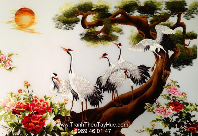 Tranh thêu hoa mẫu đơn tùng hạc THMD01