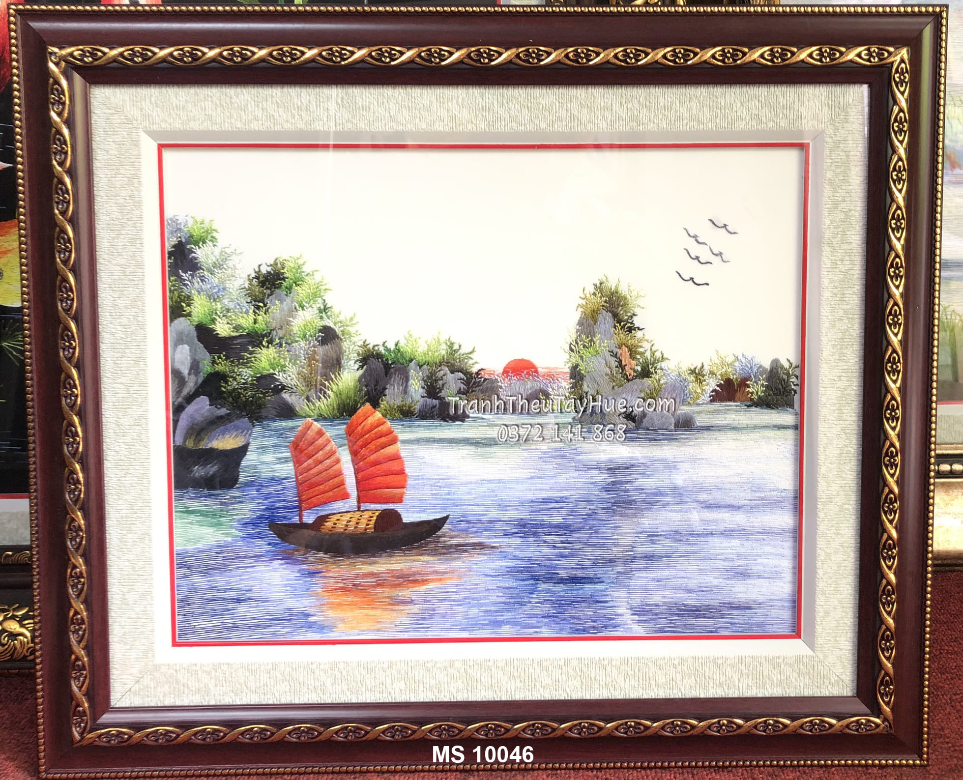 Tranh thêu thuận buồm xuôi gió mà bạn đang xem là một trong những tác phẩm tranh thêu đặc sắc của nghệ thuật thêu tay truyền thống xứ Huế. Những bức tranh thêu này được thêu hoàn toàn bằng tay bởi những nghệ nhân tài hoa và dày dặn kinh nghệm của đất kinh thành Huế.