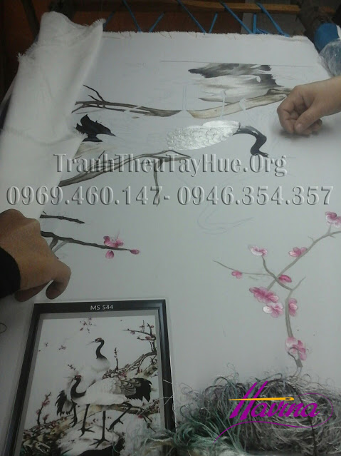 Nguyên liệu được sử dụng: Chỉ tơ kết hợp với chỉ DMC Pháp thêu trên vải lụa