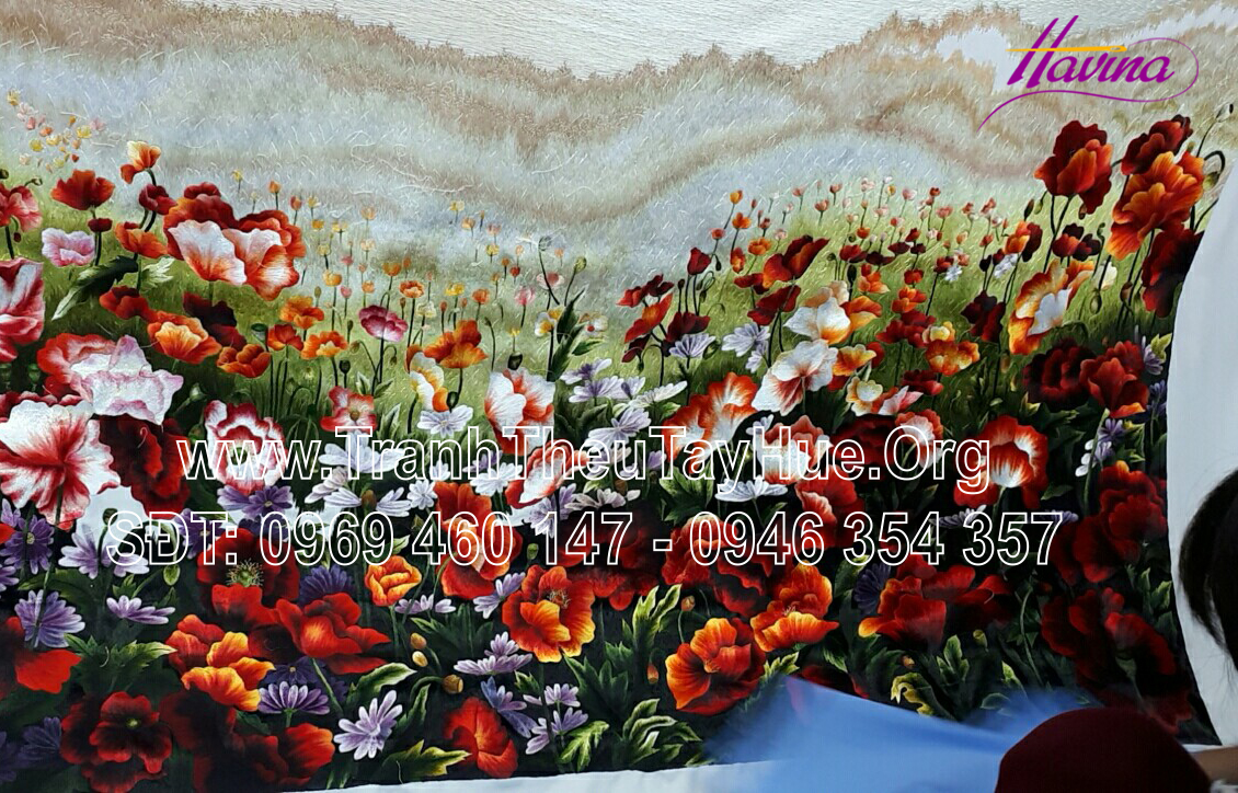 Điểm vượt trội của tranh thêu tay nằm ở nghệ thuật pha màu. Cùng một màu đỏ nhưng chỗ đậm, chỗ nhạt, chỗ sáng, chỗ tối trông rất đẹp mắt. Nhờ vậy mà bức tranh thêu hoa colico trở nên sắc sảo và có chiều sâu hơn rất nhiều.