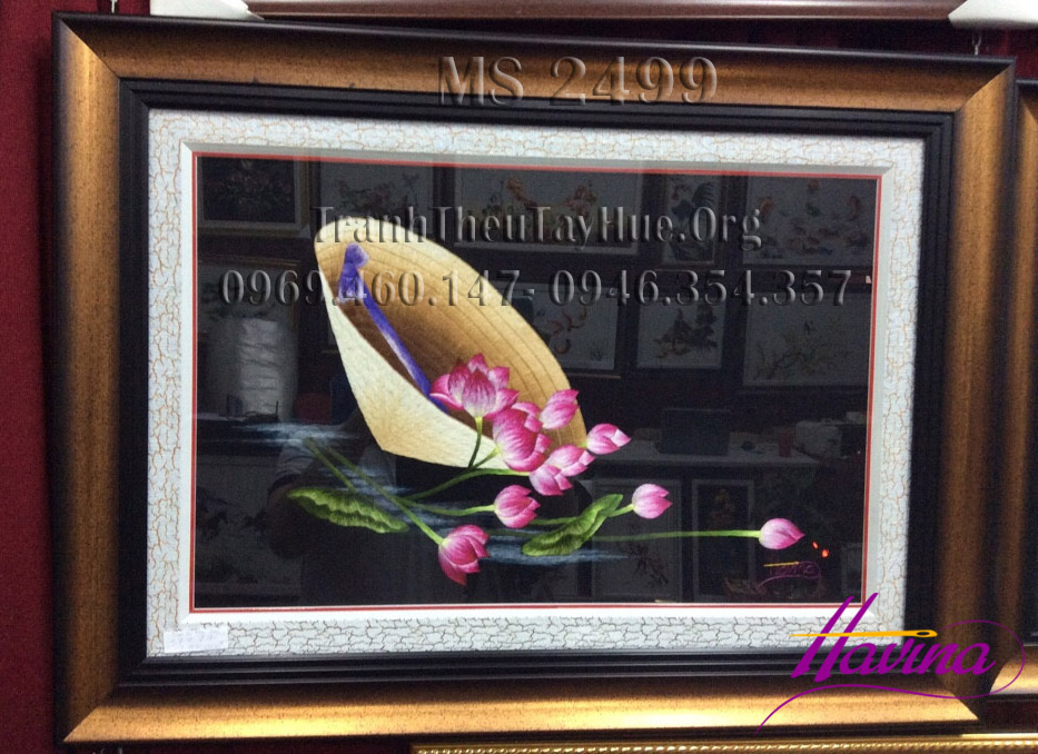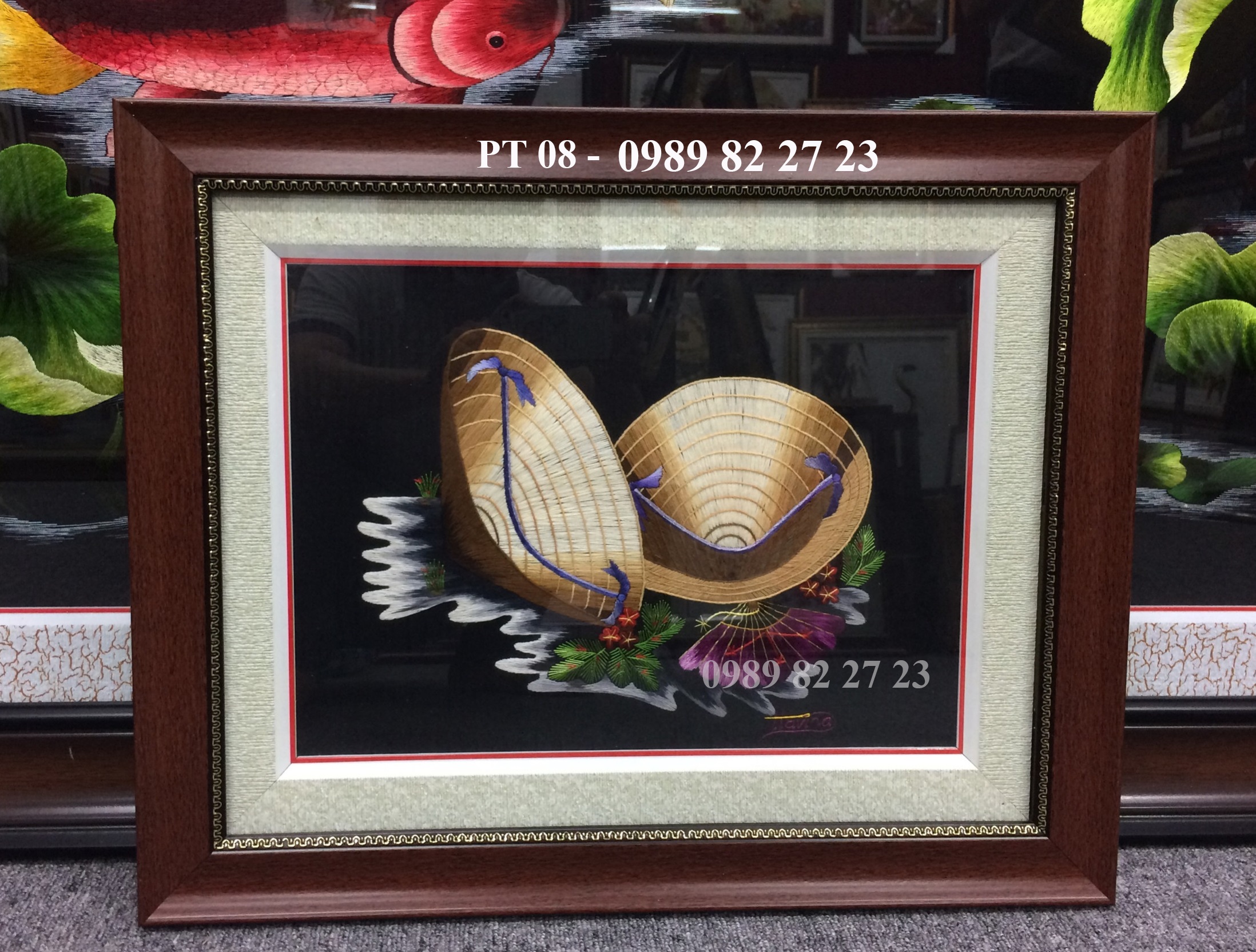 Tranh thêu nón lá hoa sen là mẫu tranh thêu khá quen thuộc ở Tranh thêu tay Huế. Nhiều khách hàng chọn mua tranh để trang trí nhà ở và làm quà dành tặng bạn bè, đối tác. Đặc biệt, bức tranh sẽ là món quà dành tặng người nước ngoài rất ý nghĩa mà bạn không thể bỏ qua.